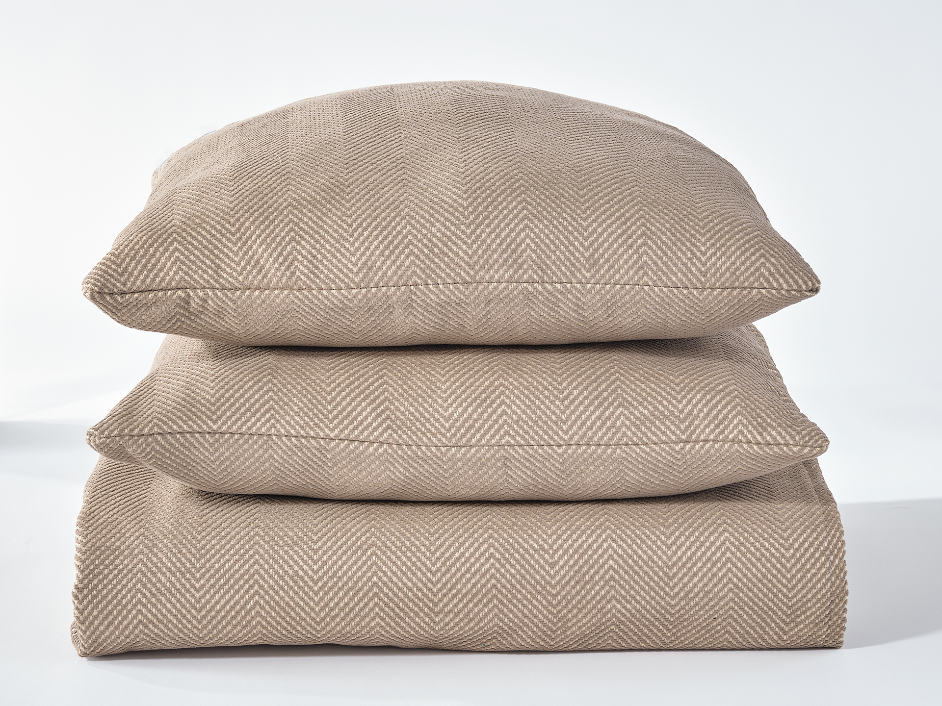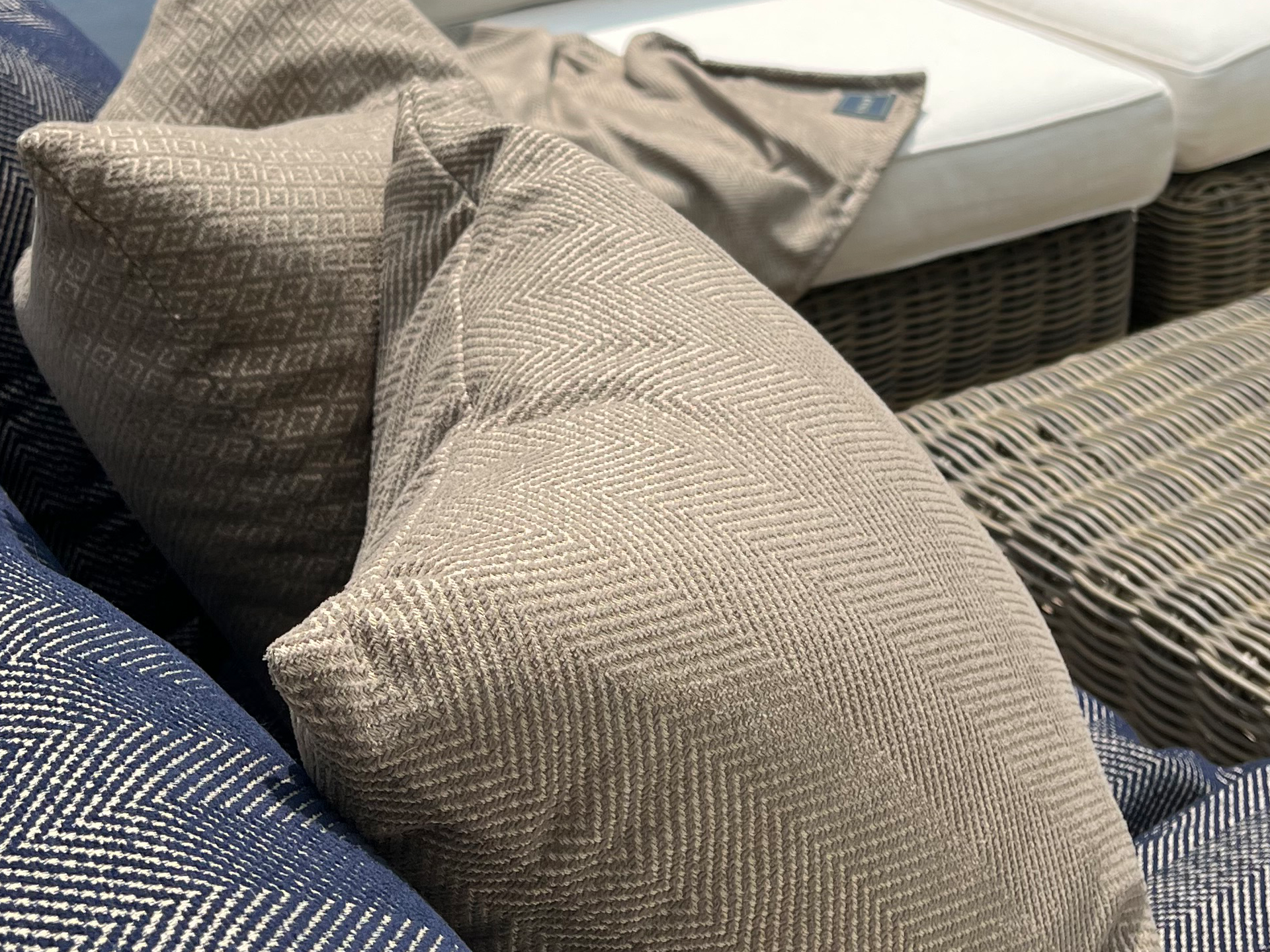 LiLLE Bluffton indoor/outdoor pillow covers in tan and cream herringbone come in sets of two, measure 18" x 18", are durable and easy to clean.