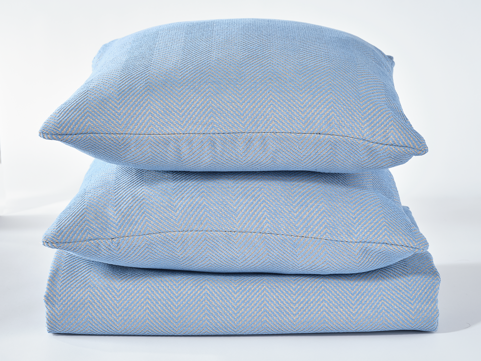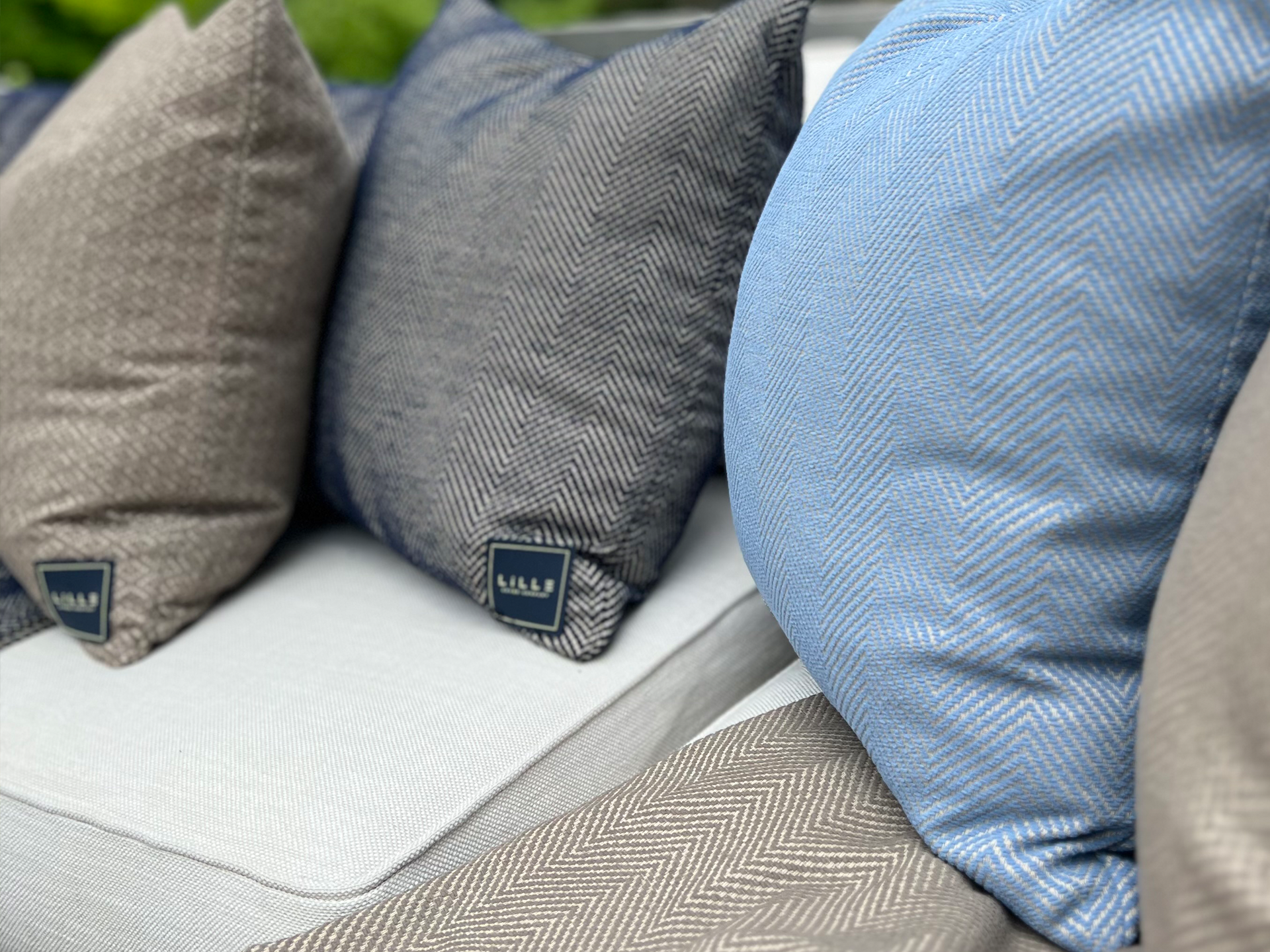 LiLLE Charleston indoor/outdoor pillow covers in light blue and cream herringbone come in sets of two, measure 18" x 18", are durable and easy to clean.