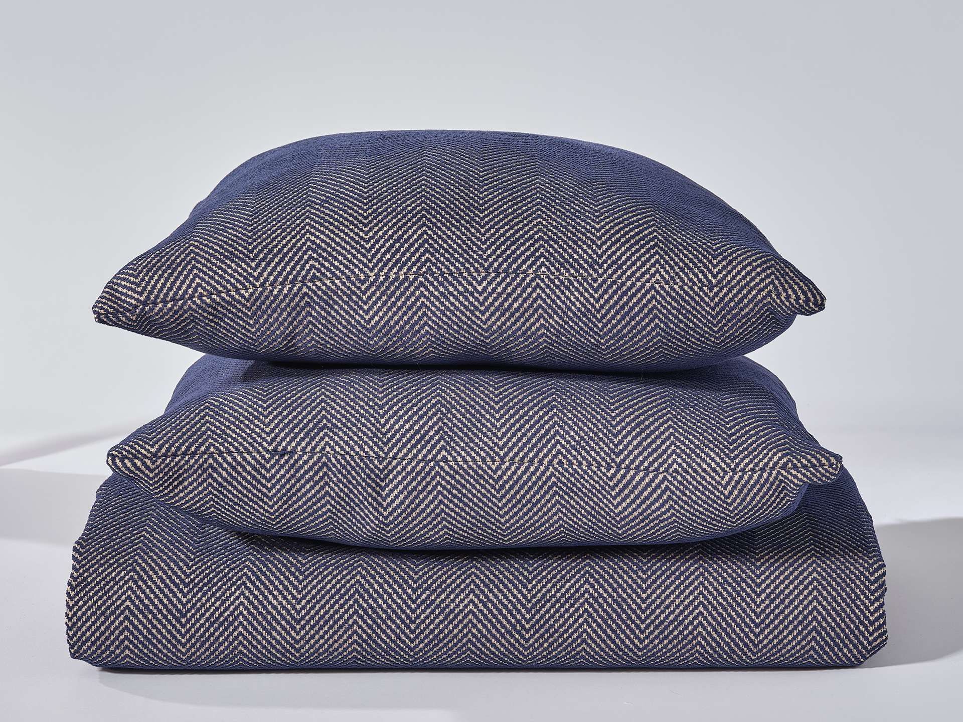 LiLLE Deephaven indoor/outdoor pillow covers in navy blue and cream herringbone come in sets of two, measure 18" x 18", are durable and easy to clean.