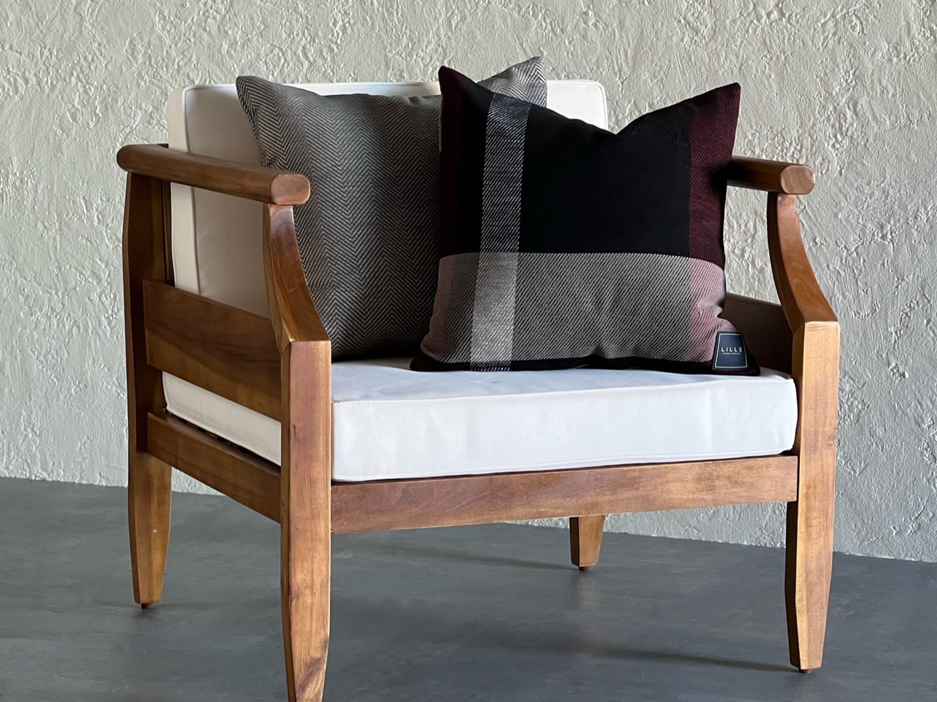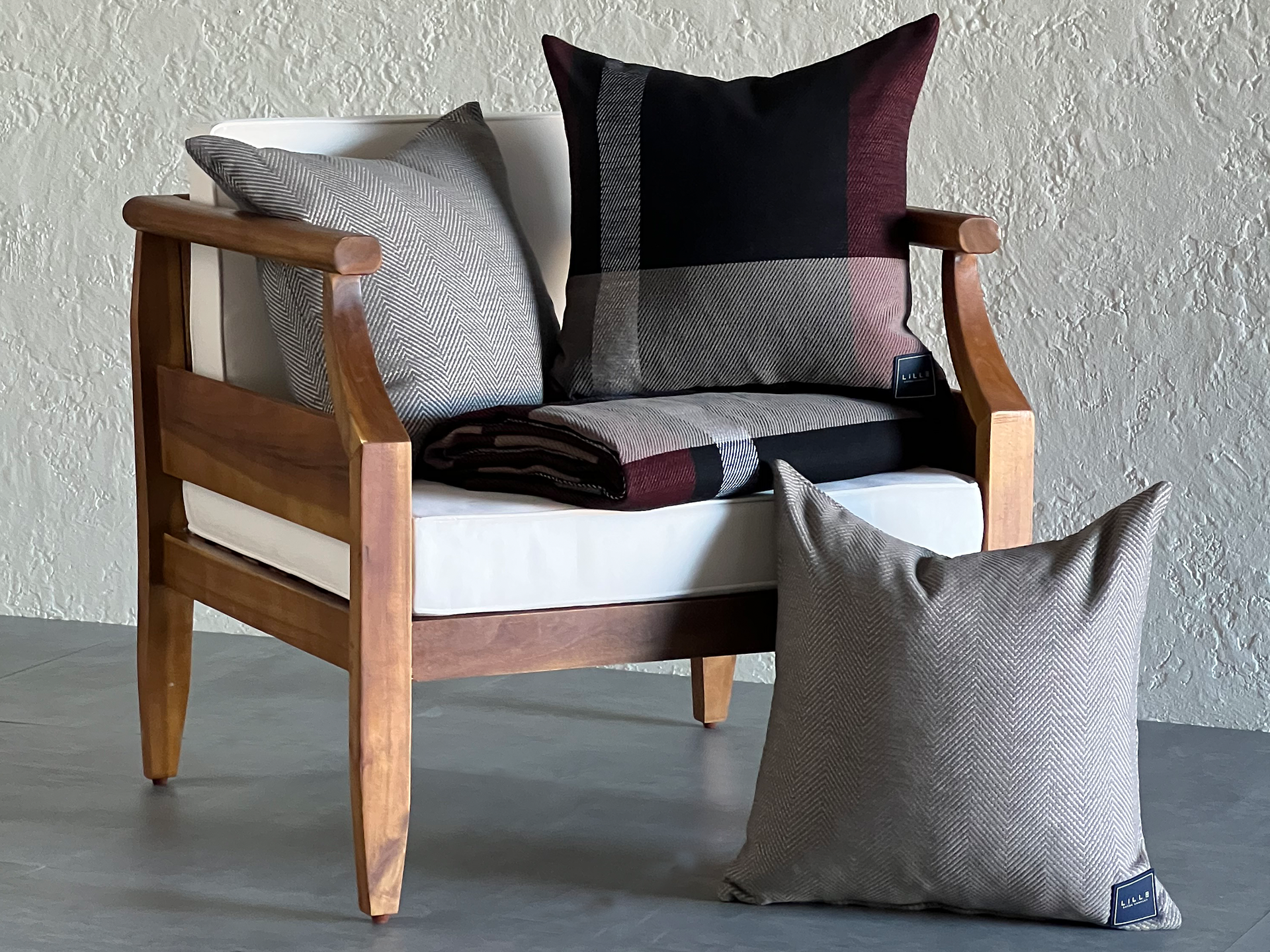LiLLE Park City indoor/outdoor pillow covers in black, red, white, and khaki plaid come in sets of two, measure 18" x 18", are durable and easy to clean.