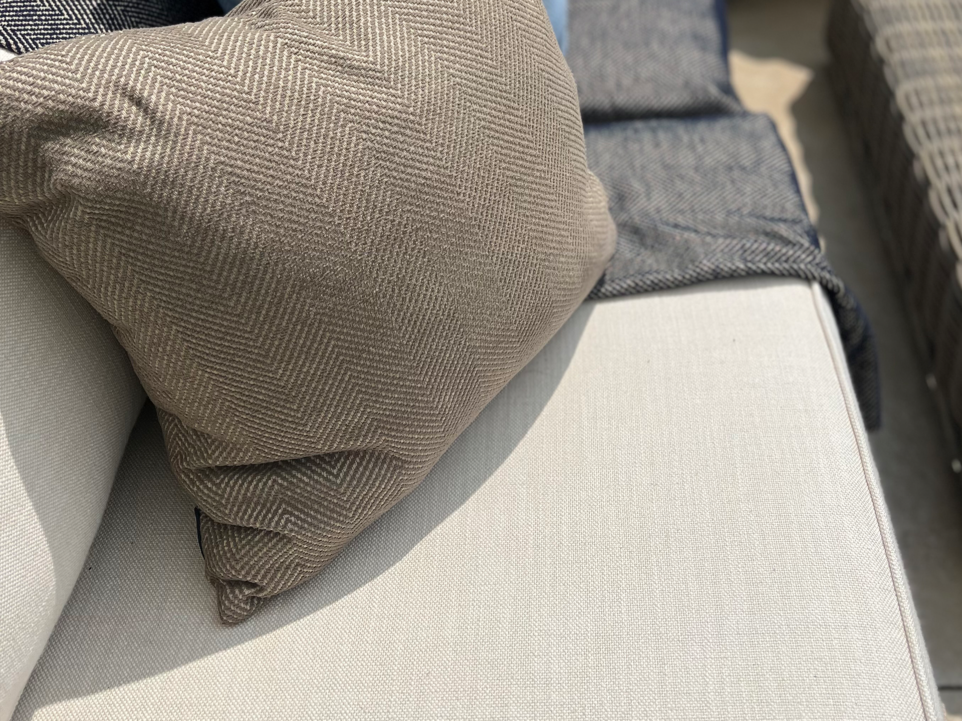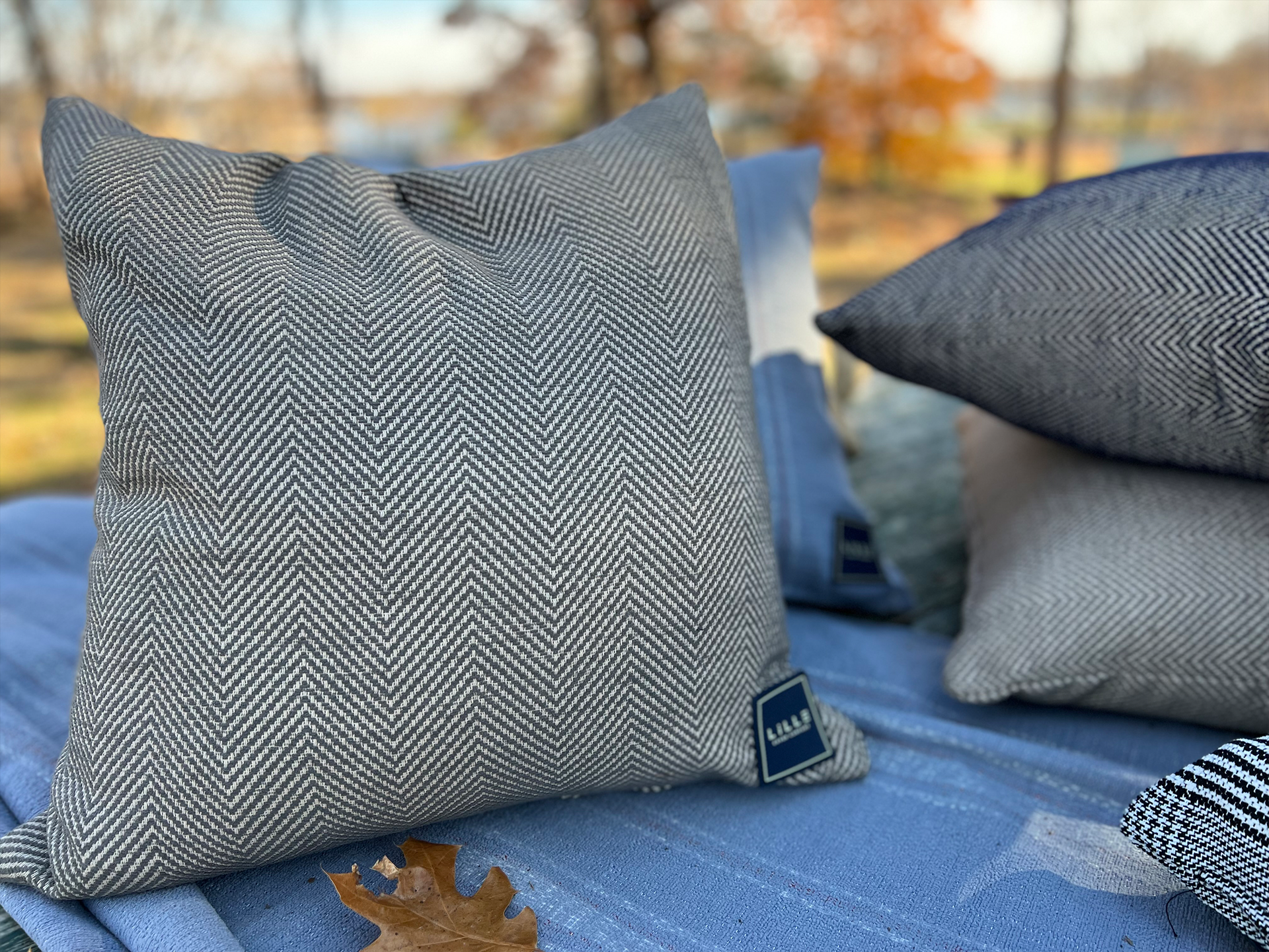 LiLLE Whidbey water resistant indoor/outdoor pillow covers in olive green and cream herringbone come in sets of two, measure 18" x 18", are durable and easy to clean.